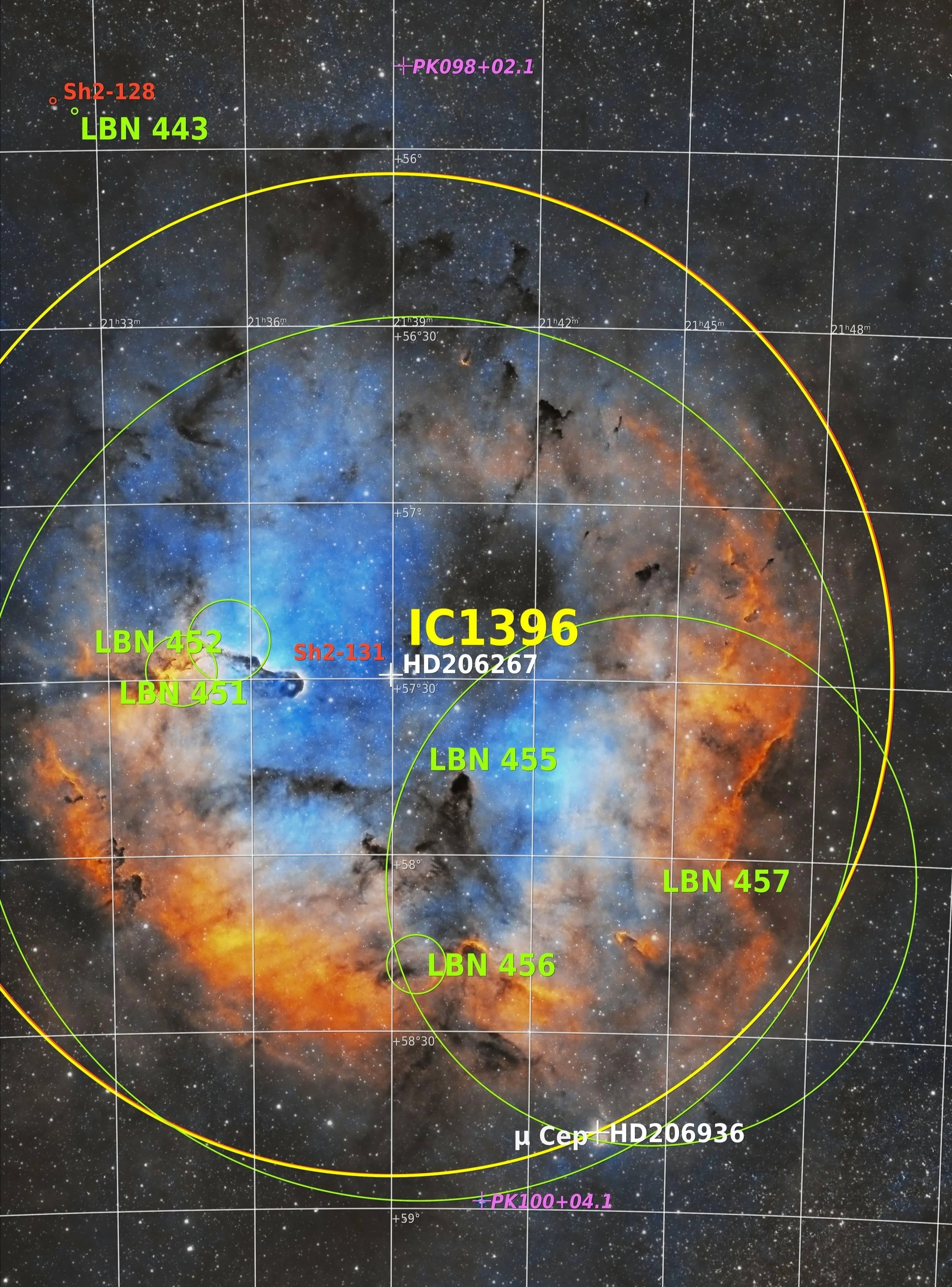 One of the most notable is the Elephant's Trunk Nebula (a.k.a. LBN 452), a dense cloud of gas and dust shaped like an elephant's elongated trunk. This and other bright nebulae are annotated in lime green.